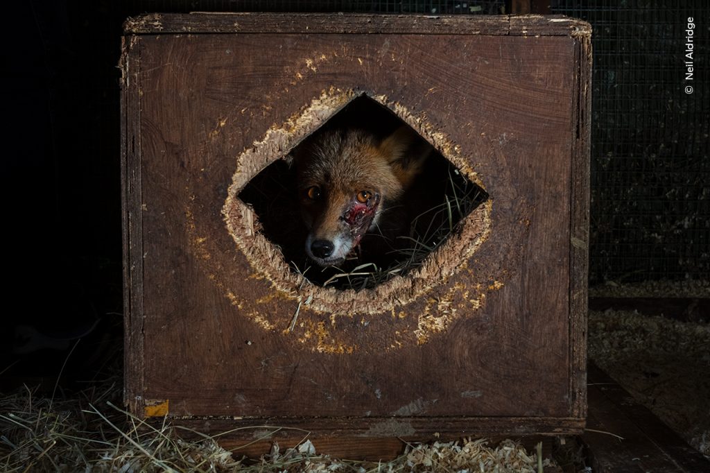 Neil Aldridge kaderde de permanent blootliggende tanden en het oog van deze vos in toen hij vanuit zijn geïmproviseerde hol in een revalidatiecentrum naar buiten gluurde. Deze foto maakt deel uit van Aldridge’s negen jaar durende project waarin hij de complexe relatie van de Britten met de rode vos fotografeert.