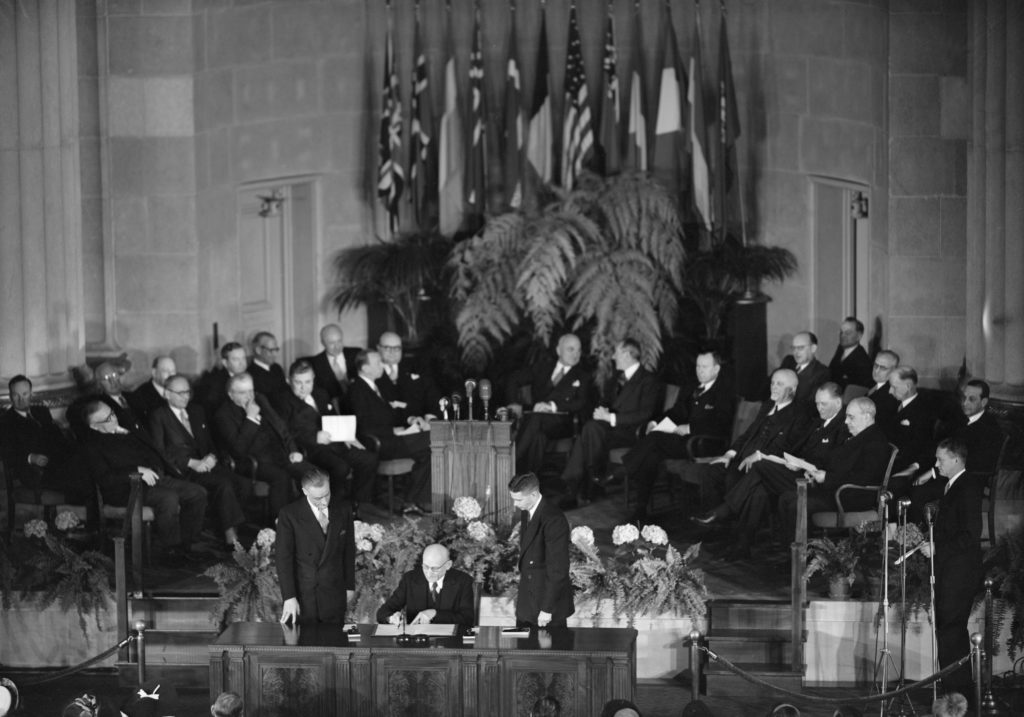 De Amerikaanse wetgeving laat het dan echter nog niet toe om in vredestijd militaire verdragen te sluiten. Maar de Blokkade van Berlijn verandert deze houding. Nog geen drie maanden nadat het Verdrag van Brussel wordt ondertekend, neemt de Amerikaanse regering een resolutie aan en gaan de VS om de tafel met de ondertekenaars van het verdrag en met Canada. Deze gesprekken leiden uiteindelijk op 4 april 1949 tot de oprichting van de NAVO. De leden moeten samen de democratie bewaken, maar belangrijker nog: elkaar beschermen. Artikel vijf van het verdrag, dat door twaalf landen wordt ondertekend, stelt dat wanneer één NAVO-land wordt aangevallen, dit wordt beschouwd als aanval op de gehele organisatie.