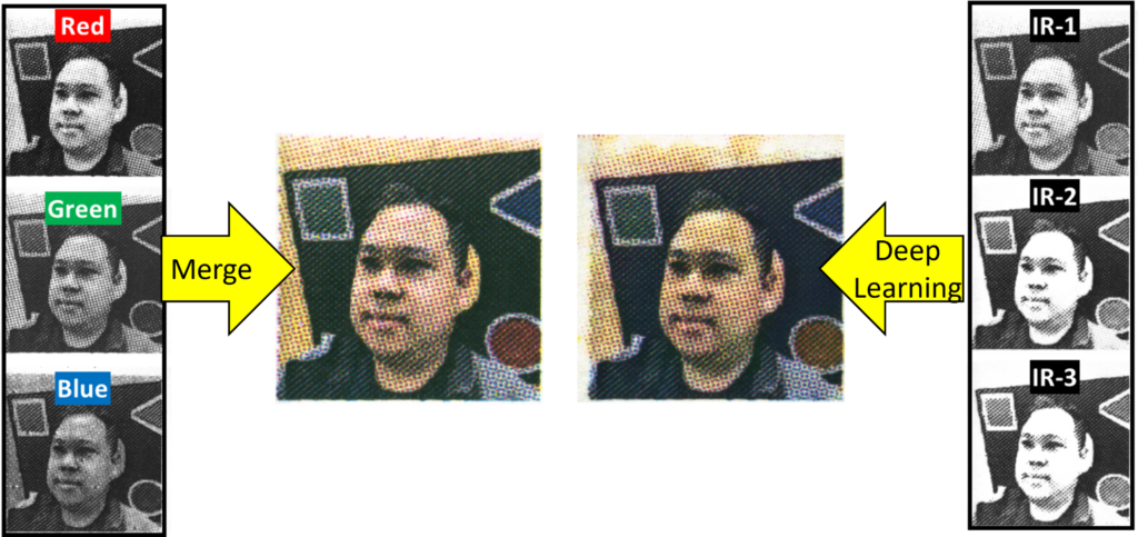 Met een camera die zowel foto’s in zichtbaar licht als infrarood licht kan schieten, kiekte het team 140 foto’s van verschillende geprinte gezichten. Vervolgens trainden ze een neuraal netwerk om patronen tussen de infrarode ‘nachtfoto’s’ en de gekleurde ‘zichtbare dagfoto’s’ te spotten.