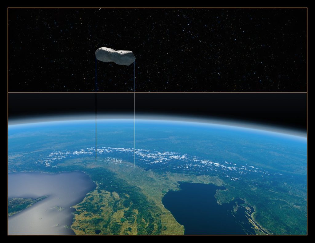 Met kiekjes van de tuimelende planetoïde (zie afbeelding hierboven), genomen tussen 2017 en 2019, wisten de astronomen het meest gedetailleerde 3D-model van Kleopatra tot nu toe te maken. Het team schat de ruimterots op ongeveer 270 kilometer lang. Ook schatten ze de volume van het brokstuk.