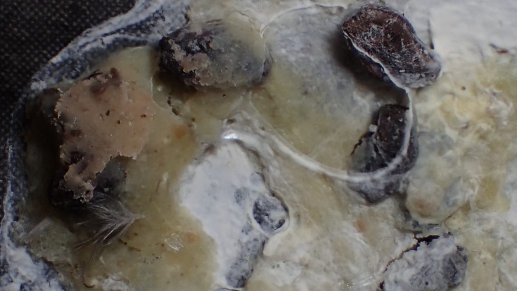 Een lab-experiment van dezelfde onderzoekers in 2018 wijst wel in die richting. Daarbij voerden ze zwangere wandelende takken aan de in Japan veel voorkomende zangvogel bruinoorbuulbuul, en verzamelden ze de uitgepoepte eitjes (zie foto hieronder). Vijf tot tien procent van de eitjes bleek nog intact. En hoewel de eitjes niet uitkwamen (dat is onder normale omstandigheden al lastig genoeg, staat in de publicatie), lijkt deze studie de theorie van vogels als verspreider van eitjes te staven.