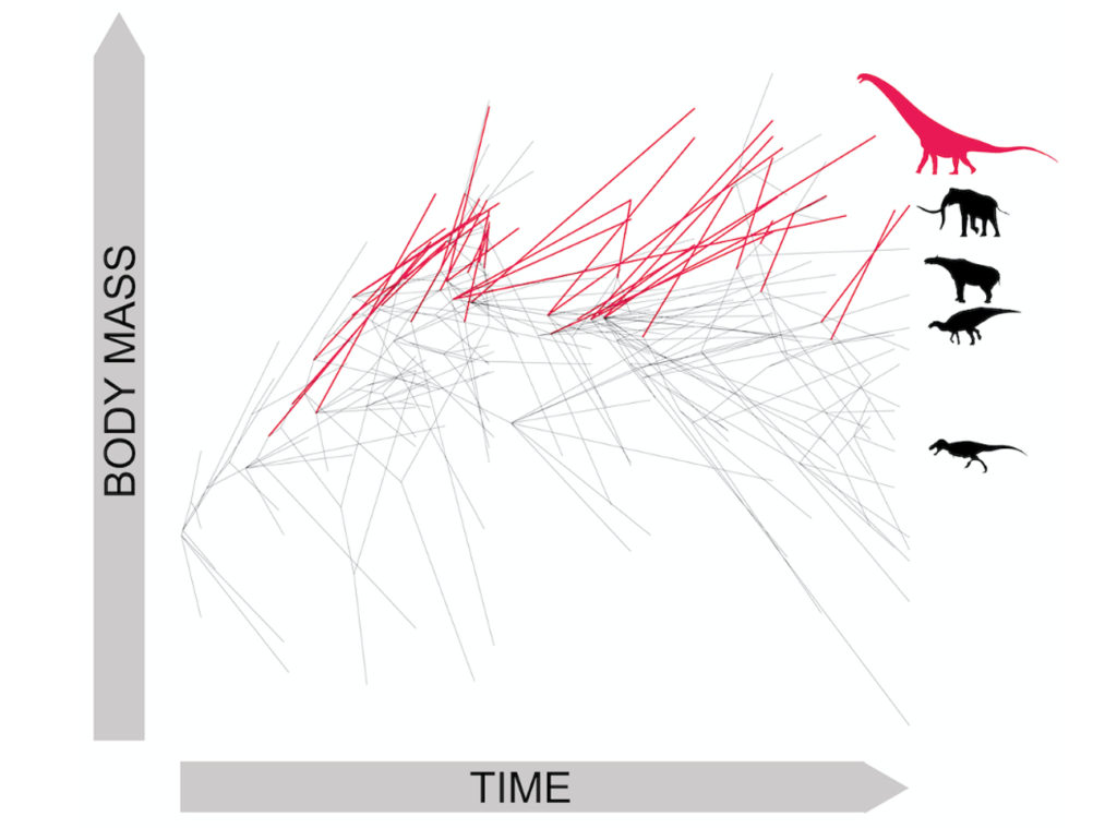 Elke lijn in de grafiek hierboven vertegenwoordigt een langnekdinosoort. Rechts zie je ter vergelijking van boven naar beneden de silhouetten van een sauropode, een mammoetachtige, een neushoornachtige, een Hadrosaurus en de welbekende Tyrannosaurus rex. Je ziet dat zeker dertig sauropoden klein beginnen (het startpunt van de rode lijn ligt laag), maar al vrij snel een recordmassa bereiken.