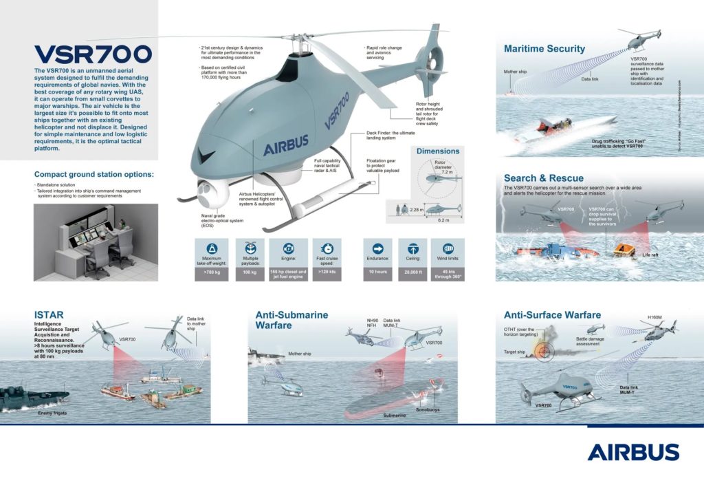Onbemande luchtvaartuigen (UAV’s) spelen tegenwoordig een steeds belangrijkere militaire rol, vooral op zee. Ze kunnen namelijk vanuit de lucht ondersteuning bieden aan schepen. Veel UAV’s worden gelanceerd van het dek van vliegdekschepen of via katapulten, maar deze lanceertechnieken zijn lastig uit te voeren op kleinere schepen op ruige zeeën. Dankzij nieuwe technologische snufjes moet de tactische VSR700 helikopterdrone van Airbus dat wel kunnen. Onlangs voerde deze drone de eerste tests op zee uit. En die waren succesvol, melden Airbus Helicopters (voormalig Eurocopter), Marignane, en de Franse Armament General Directorate (DGA) in een persbericht.