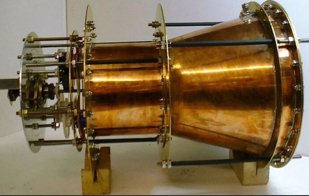 In 2014 keken wetenschappers van NASA Eagleworks naar de bevindingen van Chinese collega’s. Die beweerden al in 2009 dat ze een ruimtemotor hadden ontwikkeld die werkte zonder brandstof en zonder daadwerkelijk iets uit te stoten. Dus zelfs geen geladen deeltjes waarmee een ionenmotor voor aandrijving kan zorgen. (Voor alle duidelijkheid; een EmDrive is dus niet hetzelfde als een ionenmotor. Die laatste bestaat wel degelijk en werkt door deeltjes te ioniseren en vervolgens elektromagnetisch uit te stoten.)