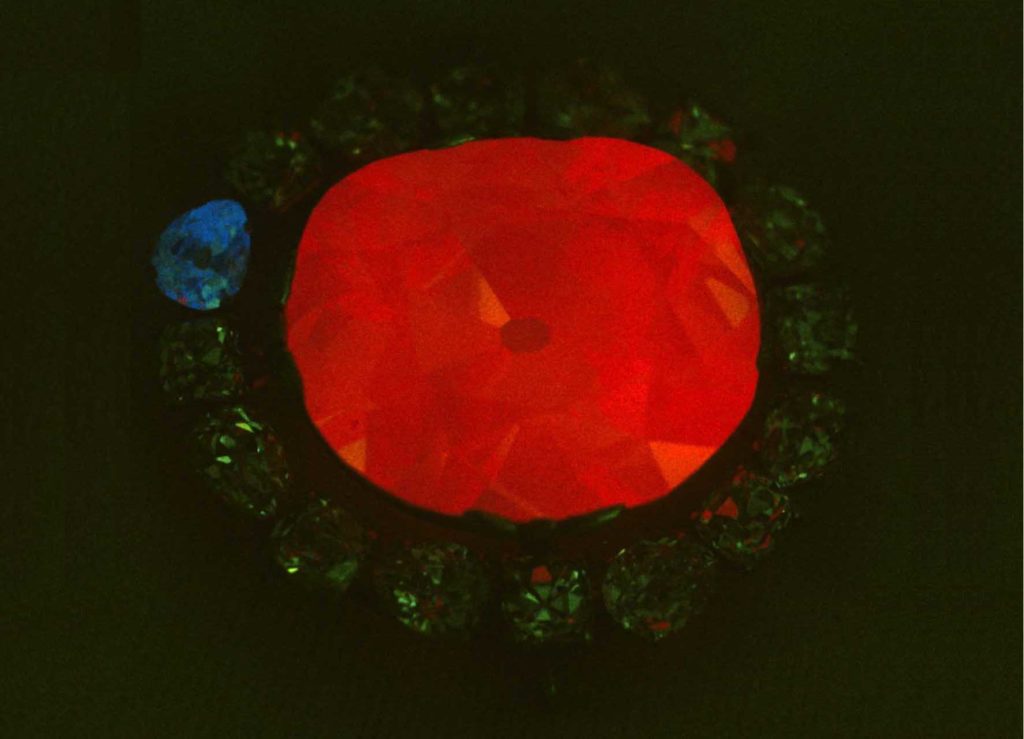 Hierbij absorbeert een materiaal licht, maar in plaats van het direct af te geven (zoals het geval is bij fluorescentie) zendt de stof het licht later pas weer uit. Een fosforescerende stof kan tot wel enkele uren nalichten. De zeer zeldzame type IIB-diamanten (foto) zijn van nature fosforescerend. Een handige eigenschap, want zo kan een juwelier de echte van de neppe onderscheiden.