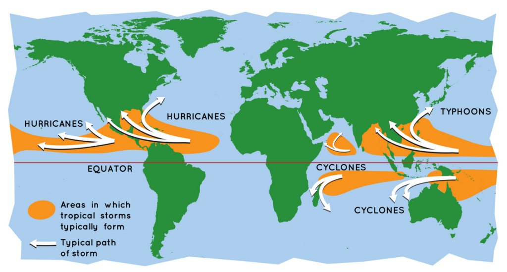 Een tropische cycloon is een storm met windsnelheden van meer dan 117 kilometer per uur (windkracht 12). De plek waar zo’n storm ontstaat, bepaalt de terminologie. In de Atlantische Oceaan en de Grote Oceaan (nabij Amerika) worden ze orkanen (of hurricane) genoemd. Vinden ze hun oorsprong in de buurt van China en de Filipijnen, dan heten ze doorgaans tyfoon. In de Indische Oceaan en in de buurt van Australië noemen ze het natuurverschijnsel vaak gewoon een cycloon of tropische cycloon. Zie ook de onderstaande afbeelding.