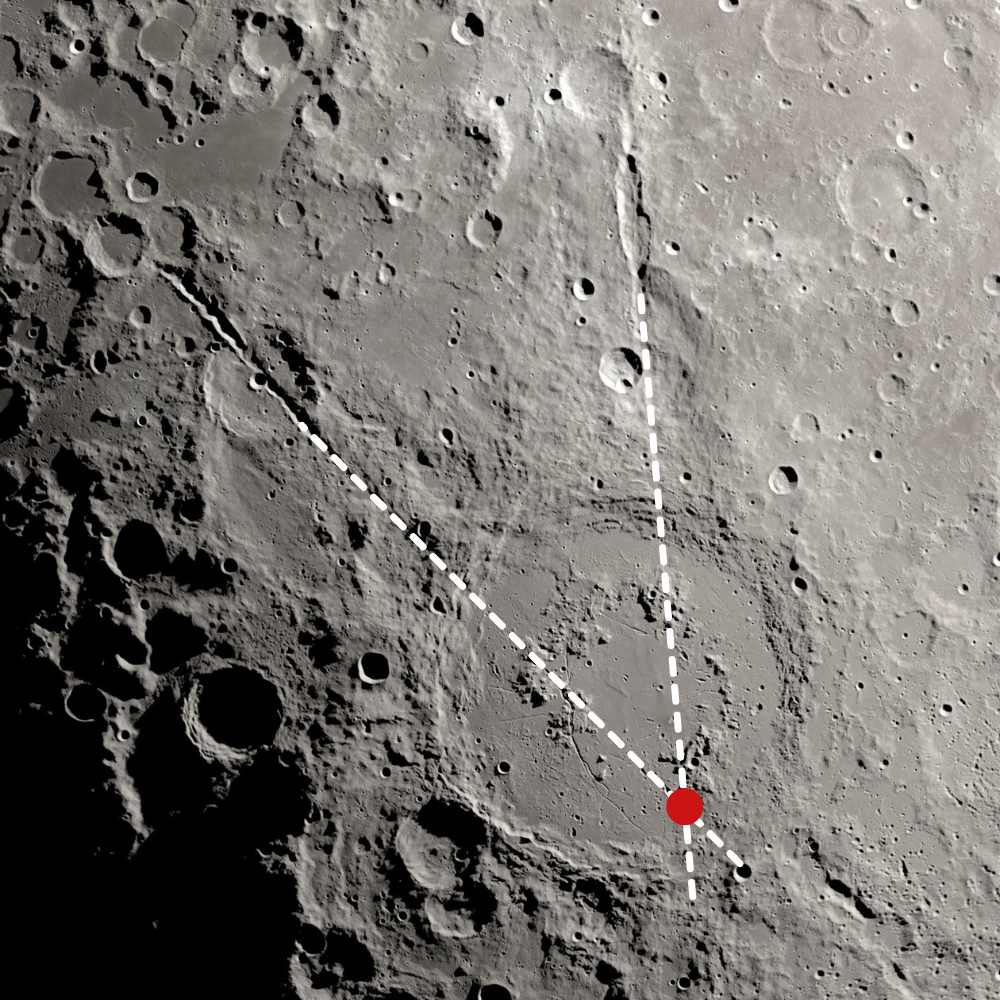De twee ‘Grand Canyons van de maan’ beginnen pas op enige afstand van de impactkrater. Als je de lijnen denkbeeldig doortrekt richting de krater, ontmoeten ze elkaar niet in het midden daarvan, maar veel zuidelijker en een beetje naar het oosten. Dat is volgens de onderzoekers waarschijnlijk de plek waar het botsende object als eerste contact maakte met de maan.