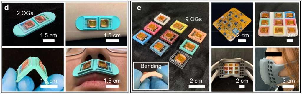 Links: het plaatje met twee geurgeneratoren dat je onder je neus plakt. Rechts: het masker met negen geuropwekkers. Beeld: Liu et al., 2023.