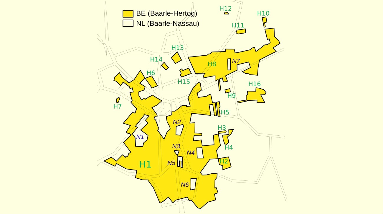 Zoals uit de andere voorbeelden op deze pagina’s blijkt, is een exclave een geografische eigenaardigheid. Maar het kan altijd gekker. Neem nu Baarle-Hertog, een Belgische exclave in de Nederlandse provincie Noord-Brabant. En binnen die exclave liggen weer zeven lapjes grond die tot Nederland behoren (zie het kaartje). Exclaves binnen een exclave dus. Het resultaat: een lappendeken van grensovergangen, die vaak dwars door straten, huizen en tuinen lopen.