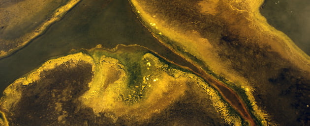 Meestal zijn micro-organismen geen succesvolle publiekstrekkers, omdat je ze toch te klein zijn om te zien. Maar in het hete water van het Yellowstone National Park vormen zij samen met exotische mineralen dikke, veelkleurige microbiële matten die eruitzien als ware kunstwerken. Zo’n mat lijkt nog het meest op een portie slijmerige lasagne, met verschillende lagen. Elke laag kent zijn eigen leefgemeenschap: kolonies van bacteriën, archaea en algen, felgekleurd zijn door pigmenten en mineralen. Soms zijn de lagen zo dik dat ze, naast bellen zuurstof, zwavelsulfide en kooldioxide, ook nog zanddeeltjes en mineralen vasthouden.