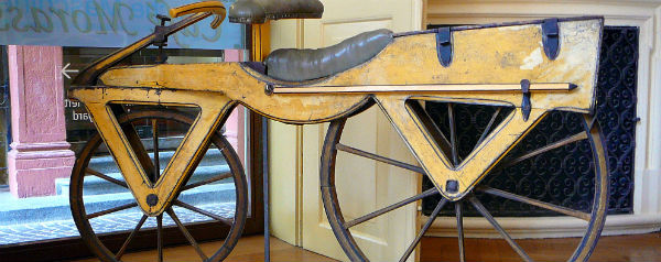 - Het verhaal van de fiets vertrekt bij de draisine (zie hierboven), in 1817 bedacht door en vernoemd naar de Duitser Karl von Drais. Het apparaat had geen tandwielen of kettingen of trappers, maar was een loopfiets. Door je bovenlichaam tegen een stang te drukken, kon je extra vaart maken.