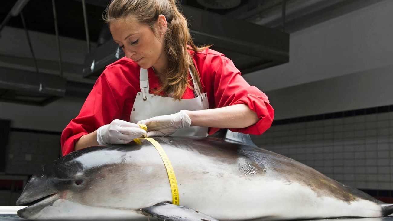 Een stuk introverter, maar minstens zo interessant, zijn de bruinvissen. Deze zeezoogdieren zwemmen rond in de wateren van het noordelijk halfrond en zijn de kleinste tandwalvissen (een onderorde van dieren waar ook de dolfijn en potvis toe behoren) van de Noordzee. Ze kunnen een maximale lengte van ongeveer 1,80 meter en een gewicht van 65 kilo bereiken. En dat komt goed uit voor bioloog Lonneke IJsseldijk: “Door dit kleine formaat kun je het dier makkelijk optillen, meevoeren en op de snijtafel leggen.”
