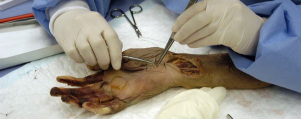 De snijzaal van het VU medisch centrum in Amsterdam is, met enig gevoel voor horror, in de kelder gesitueerd. Als je van de trap afkomt, vertellen A4’tjes wat hier de bedoeling is: sieraden moeten af en de labjas moet aan én dicht. Je kunt je goed voorstellen hoe studenten geneeskunde hier staan te wachten, sommigen ongeduldig, anderen een tikkeltje nerveus, tot ze door de klapdeuren mogen.
