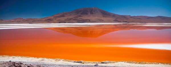 Het Boliviaanse Colorado Lake is een zout meer met een opvallende kleur. De witte vlekken ontstaan door het mineraal borax. Dit is het natriumzout van boorzuur, dat niet oplost in koud, zout water. In plaats daarvan blijft het drijven op het oppervlak, waardoor er een groot contrast ontstaat met het rode water, dat zijn kleur onder meer dankt aan het pigment van bepaalde algensoorten die in het meer leven.