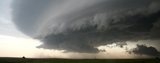 Hieronder zie je een wolk die je liever niet tegenkomt tijdens een tochtje op het platteland. Deze wolk heet een wall cloud (er bestaat geen Nederlandse naam voor) en hij maakt deel uit van een superstorm. De lucht in de ‘wolkenmuur’ draait razendsnel rond; het is dan ook niet verwonderlijk dat dit de kraamkamer is van alles verwoestende tornado’s. Een wall cloud ontstaat als koude neerwaartse lucht beneden in de wolken botst met warme, naar boven roterende lucht.