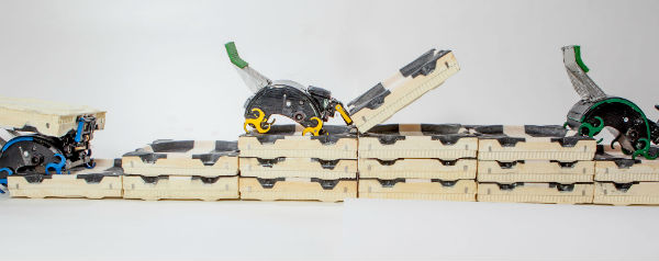 Hij heeft wel wat weg van een mestkever, de robot die is gebouwd door Harvard-onderzoeker Kirstin Petersen. Niet alleen aan de buitenkant trouwens; ook wat gedrag betreft. Maar in plaats van een mestbal te verplaatsen, manoeuvreert hij met een brick, een tegel van piepschuim. En in plaats van pootjes heeft de robot, net als een vorkheftruck, een tweetandig stuk gereedschap dat hij heen en weer beweegt in de daarvoor bestemde openingen van het stuk piepschuim. Eerst gebeurt het aarzelend, een beetje erin en een beetje eruit, maar ineens klapt de vork om en ligt de brick op zijn rug. Vervolgens gaat de robot ermee aan de wandel en legt hij hem op een muurtje van twee stenen hoog.