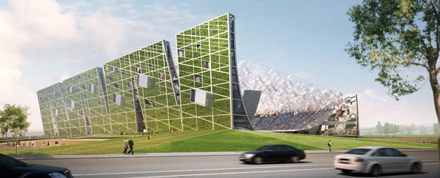 Dit architectonische hoogstandje, dat het nieuwe onderkomen van de Chinese voetbalclub Dalian Shide moet worden, is door zijn ontwerpers heel toepasselijk het Garden Stadium gedoopt. Een voor de hand liggende benaming voor een voetbaltempel waarvan de buitenkant met planten bekleed is. Door deze begroeiing verandert het stadion niet alleen ieder seizoen van kleur, het is ook goed voor het milieu. De architecten beweren althans dat de planten een isolerende laag vormen en zelfs luchtvervuiling tegengaan.
