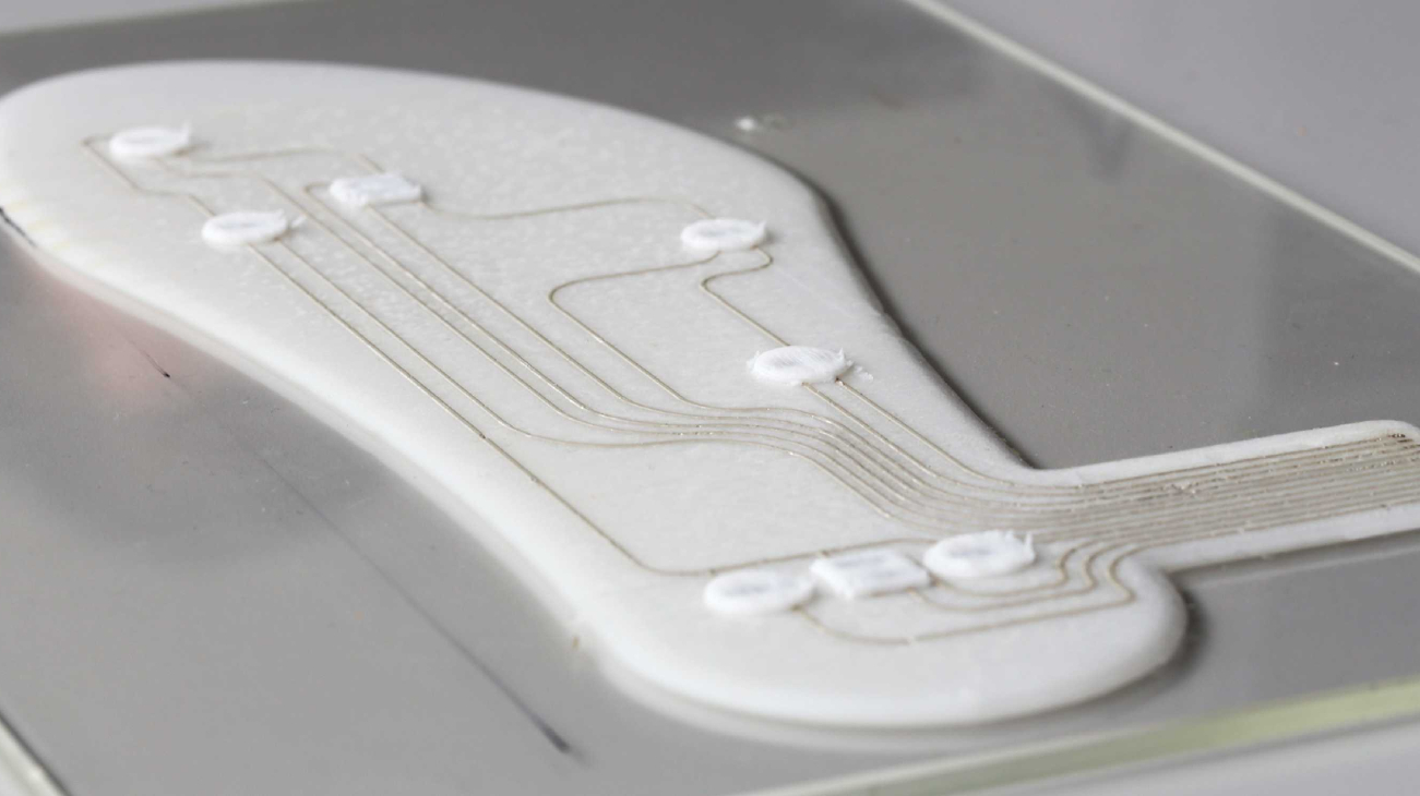 De nieuwe drukmetende schoenzool kan de oplossing zijn. Het team, onder leiding van Gilberto Siqueira, maakt zo’n zool met behulp van een 3D-printer. De basislaag bestaat uit een mengsel van silicium en celloluse-nanodeeltjes. Daarop komt de geleidende bedrading, gemaakt van zilveren inkt. Vervolgens printen de wetenschappers de druksensoren. Die komen op de plekken van de zool waarvan bekend is dat daar de voetdruk het hoogst is.