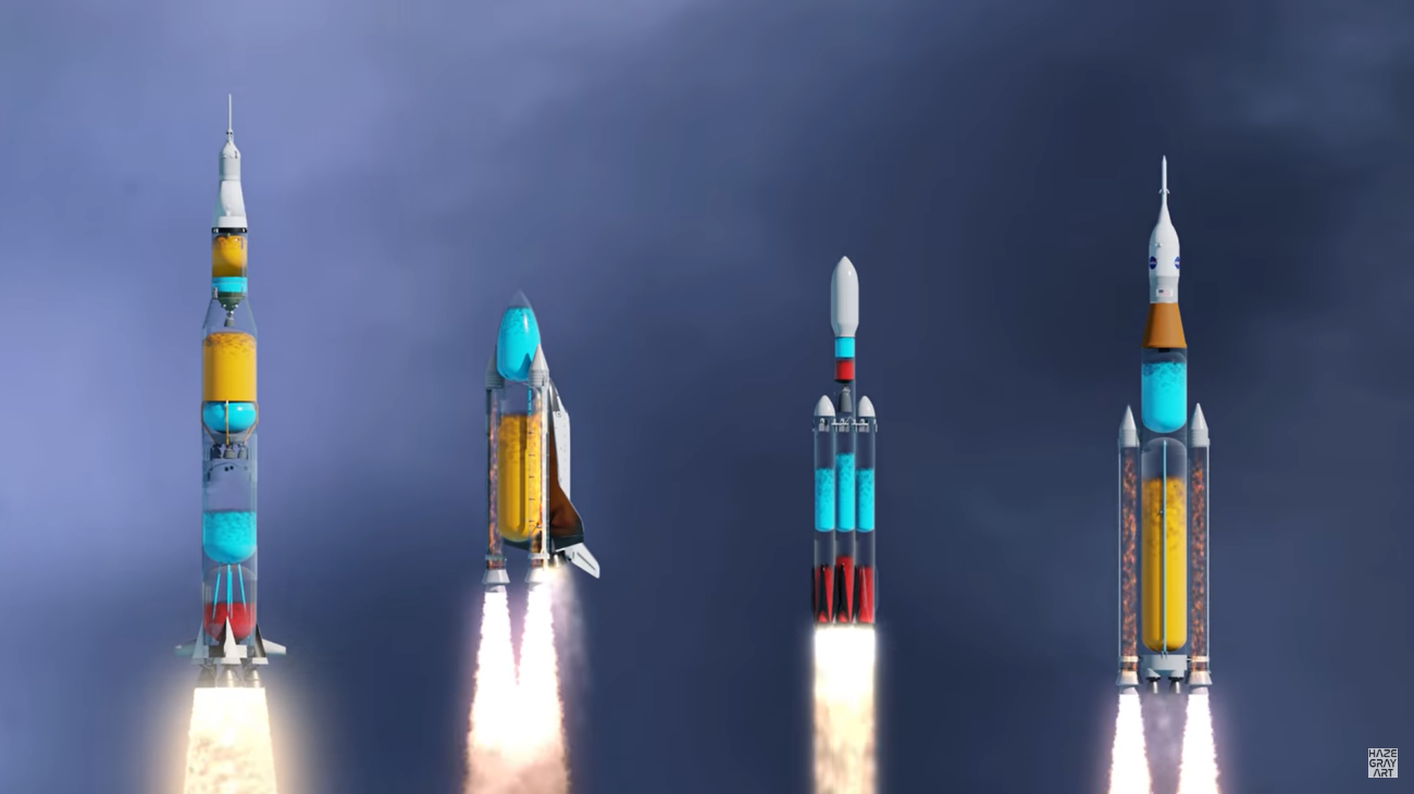 Een animatie van een viertal transparante raketten laat zien hoeveel brandstof de vaartuigen verbruiken om de lucht in te gaan. Spoiler: behoorlijk veel.