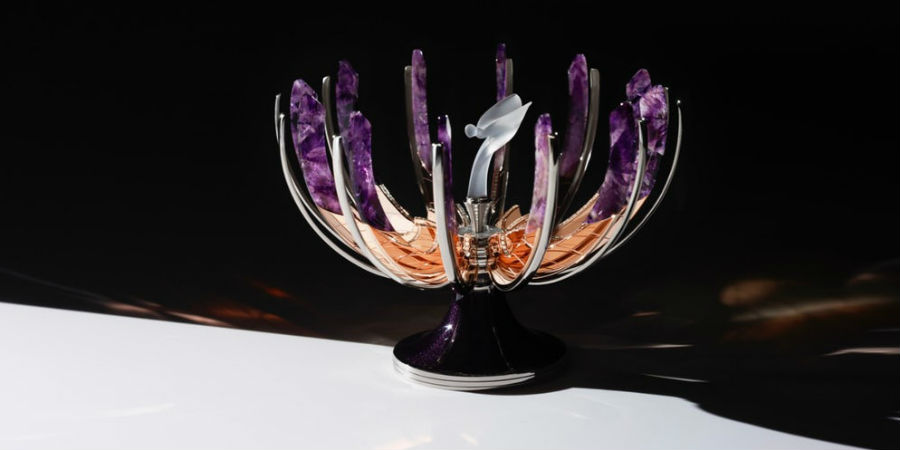 De rosé-gouden armen van het ei kunnen zich sluiten om de mascotte en zijn bezet amethisten en versierd met diamanten. © Rolls-Royce