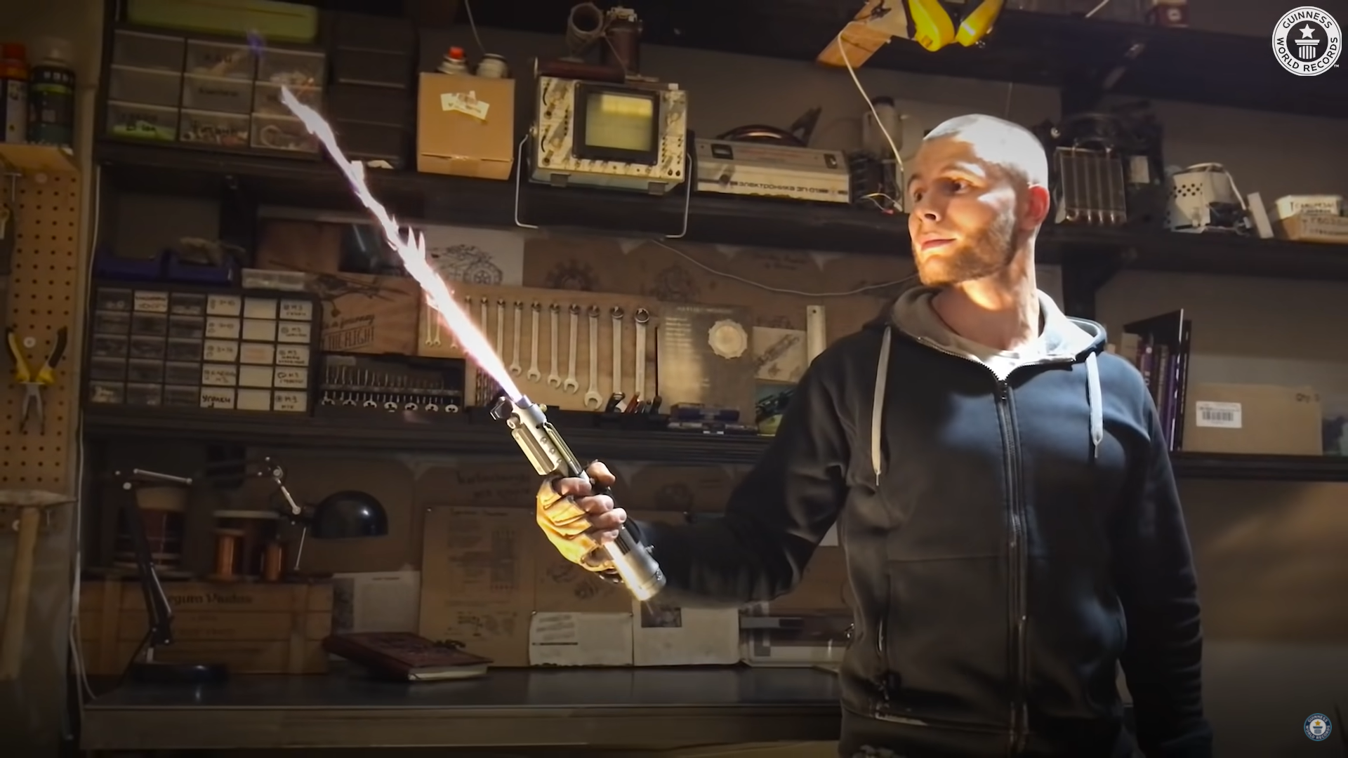 Niks geen lichtgevende, plastic buis met een verborgen speakertje; het Star Wars-lichtzwaard (lightsaber) dat de Russische Alex Burkan maakte, is een flink niveau hoger dan de varianten die je in de speelgoedwinkel vindt. Guinness World Records beloonde de youtuber, groot fan van de scifi-reeks, dan ook met een plekje in hun beroemde recordboek. Het ‘zwaard’, een pittig ding dat met 2800 graden Celsius staal kan splijten, zou ’s werelds eerste intrekbare lichtzwaard zijn.