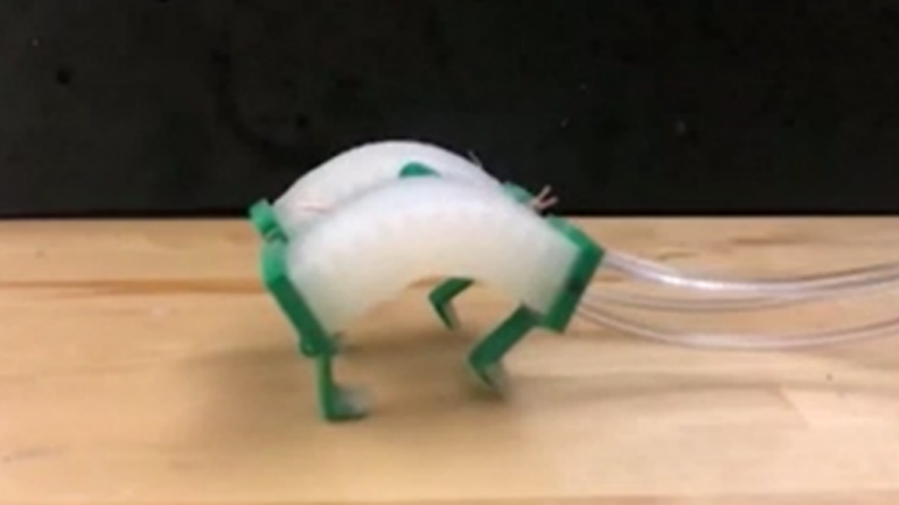 Door lucht door de buisjes in de zachte, siliconen robot te pompen, kan er tussen die twee stabiele houdingen geswitcht worden. “Bij die overgang”, zo legt coauteur Jie Yin uit, “komt een aanzienlijke hoeveelheid energie vrij.” Met die energie kan de kleine bot zich als het ware afzetten tegen de ondergrond. Het resultaat is een – misschien een ietwat onhandig uitziende – galop; een pas waarbij de poten van de grond komen.