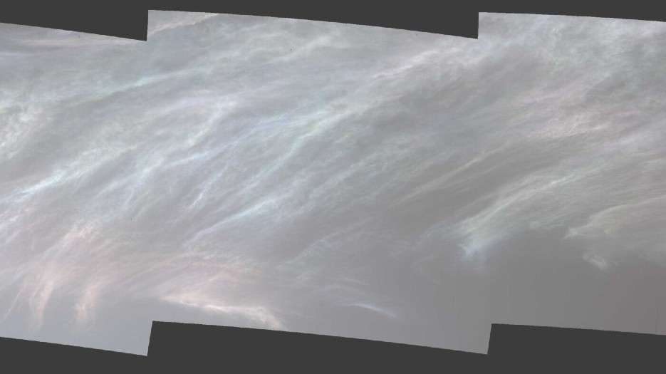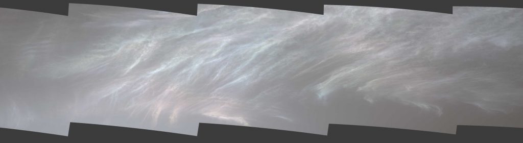 Met name de kleurenfoto’s, die Curiosity met zijn Mastcam maakte, maken een mooi plaatje. De ijskristallen in de wolken verstrooien het licht van de ondergaande zon, waardoor delen van de wispy wolken met verschillende kleuren lijken te glanzen: ze iriseren. De gekiekte wolken zijn een paar van de meest kleurrijke structuren op het verder roodbruine van Mars.