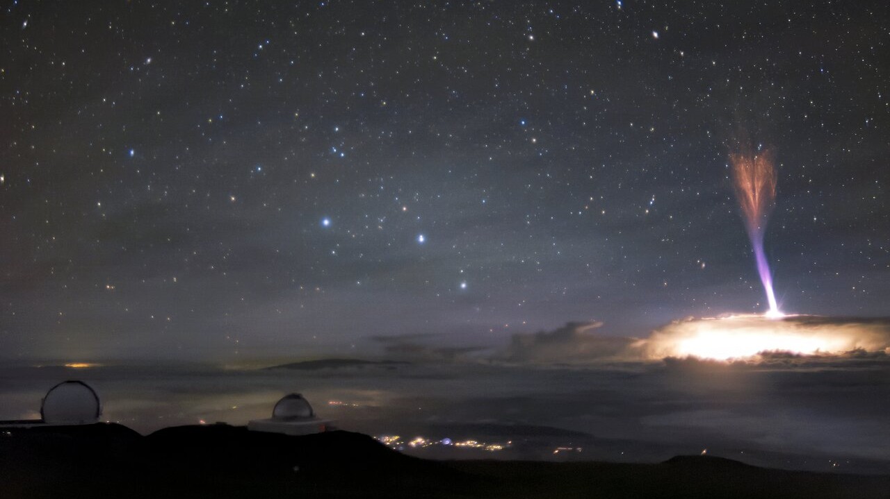 Dit lichtspel aan de Hawaïaanse avondhemel is niet alleen mooi, het is ook flink bijzonder. De rood-blauwe flits bestaat namelijk uit niet één, maar uit twee zeldzame typen bliksem. Extra leuk dus dat spiegeltelescoop Gemini-noord beiden op één prachtige foto wist vast te leggen.