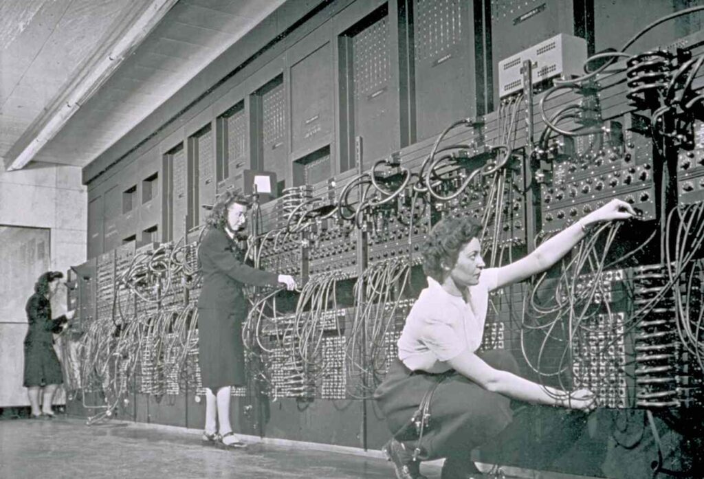 Hier zien we de ENIAC (Electronic Numerical Integrator And Computer), een van de eerste elektronische computers ter wereld. Het Amerikaanse leger onthulde de computer in 1946. Je bediende het apparaat door kabels aan te sluiten en los te koppelen, en schakelaars om te zetten. De ENIAC kostte bijna 500.000 dollar (tegenwoordig omgerekend zo’n 7 miljoen euro) en bestond uit ruwweg achttienduizend radiobuizen. Dat maakte het apparaat gigantisch groot en zwaar; het geheel woog bijna 30 ton. Pas toen de radiobuizen werden vervangen door transistors en microchips werden computers (veel) kleiner.