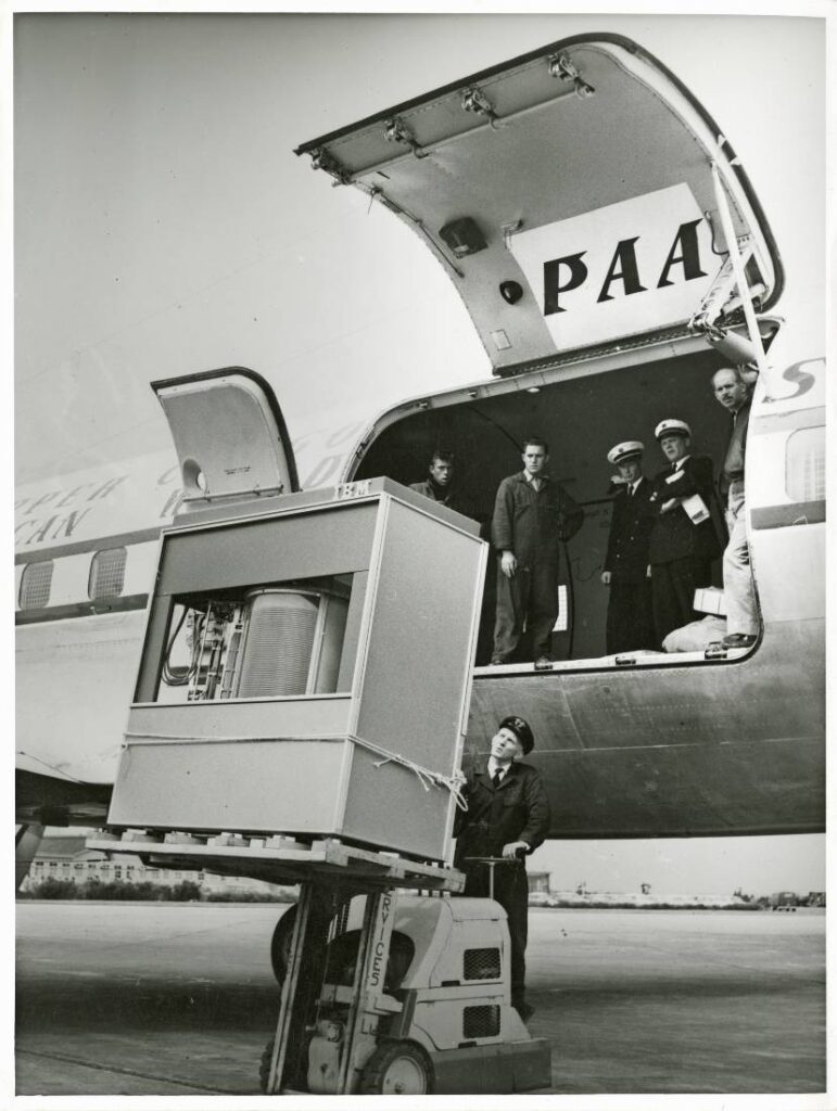 De eerste commerciële harde schijf, de IBM 350, stamt uit 1956 en werd geproduceerd door International Business Machines Corporation (IBM). Het apparaat, dat hier in een vliegtuig wordt geladen, was een onderdeel van de IBM 305 RAMAC-computer. De hard drive van 170 centimeter hoog en 150 centimeter breed bestond onder andere uit vijftig schijven met elk een diameter van 61 centimeter. Daarmee bood de IBM 350 opslagruimte voor 3,75 megabyte aan data – ongeveer evenveel als een moderne smartphonefoto.