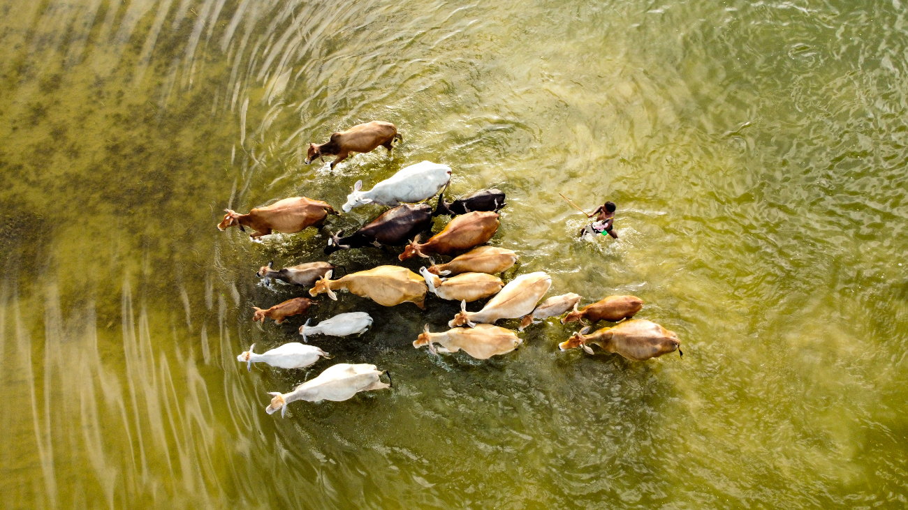 Dronefoto van een boer met zijn koeien in groen overstromingswater. Een winnaar van de Environmental Photographer of the Year-wedstrijd.