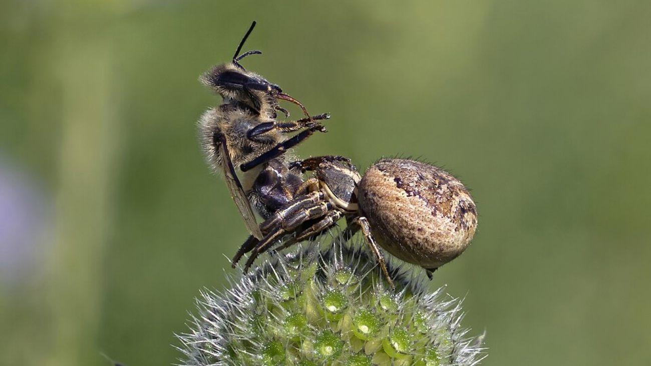 Deze vrouwelijke Xysticus cristatus, ofwel de gewone krabspin, kan gaan smullen van een bij. Ze is ongeveer zeven millimeter groot, wat iets groter is dan haar mannelijke soortgenoten van rond de vijf millimeter. Ze worden krabspinnen genoemd omdat ze zich soms als een krab bewegen: ze lopen dan niet gewoon naar voren, maar zijwaarts. Voor deze maaltijd hoefde de spin echter niet veel te bewegen.
