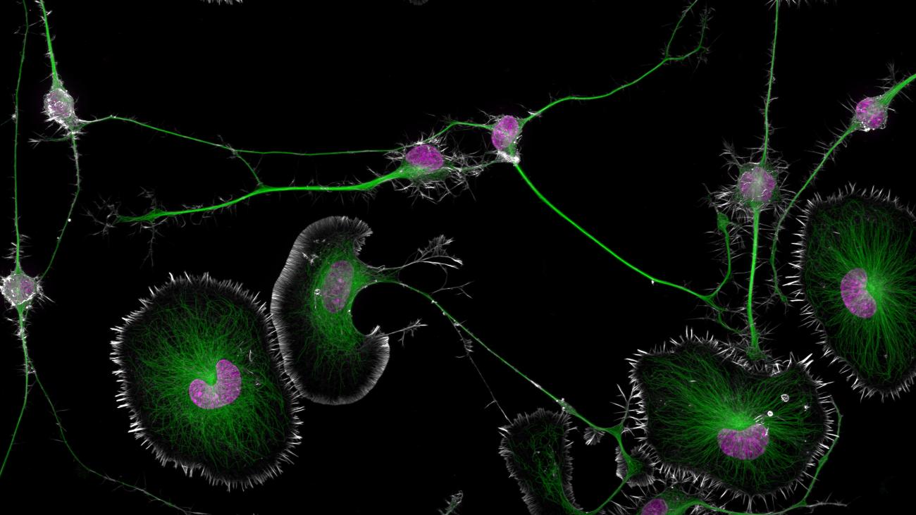 De celkernen op deze plaat zijn paars gekleurd, het structurele raamwerk van de cel (het cytoskelet) en de ‘snelwegen’ die het transport binnen de cel regelen (microtubuli) groen. Verstoringen in die laatste twee onderdelen kunnen leiden tot neurodegeneratieve ziektes, zoals alzheimer en ALS.