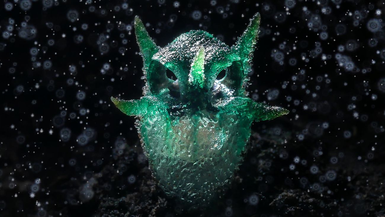 Alle spikkels op de rest van de plaat zijn hoogstwaarschijnlijk dauw- of regendruppels. Het groene wezentje springt namelijk alleen in het regenseizoen – van mei tot oktober – de grond uit, en laat dan zijn spookachtige uil-uiterlijk zien.