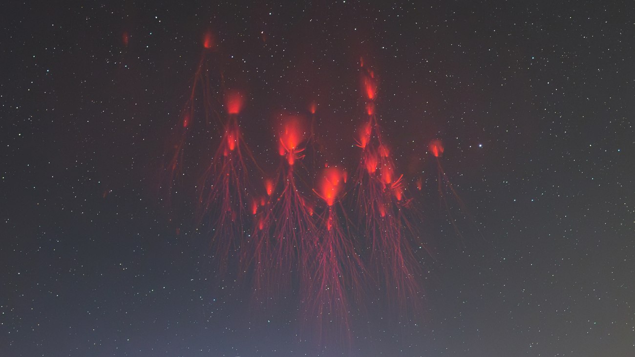 Hoe onvoorspelbaar en onwenselijk ze soms ook zijn, de slechtste weersomstandigheden zorgen vaak voor de mooiste foto’s. Hier zien we sprites, spectaculaire rood-oranje bliksemschichten die hoog boven onweersbuien ontstaan.