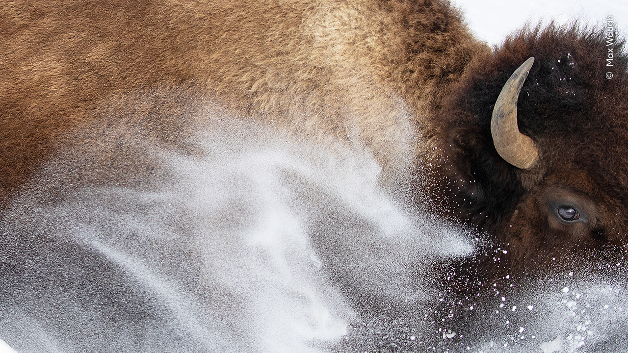 Vanuit zijn voertuig zag Max Waugh dat de bizon begon af te dalen richting de weg en steeds meer vaart verzamelde. Waugh reed snel een stukje verder om het dier de ruimte te geven om over te steken. Hij kaderde de bizon strak in om deze originele compositie te maken.