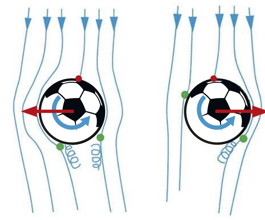 Een gewone voetbal heeft een ruw oppervlak. Wanneer die door de lucht vliegt, blijft er een klein beetje lucht aan vastplakken. Rond de bal ontstaat turbulentie; draaikolkjes van lucht. Als de bal linksom draait, beweegt de klevende lucht aan de linkerkant mee met de luchtstroom waar de bal tegenin vliegt. Aan de rechterkant beweegt de klevende lucht tegen die luchtstroom in. Daardoor beweegt de lucht rechts moeilijker om de bal heen dan links. Dat maakt de luchtdruk rechts hoger dan links, zodat de bal naar links wordt geduwd. Dit heet het magnuseffect (zie afbeelding hieronder).