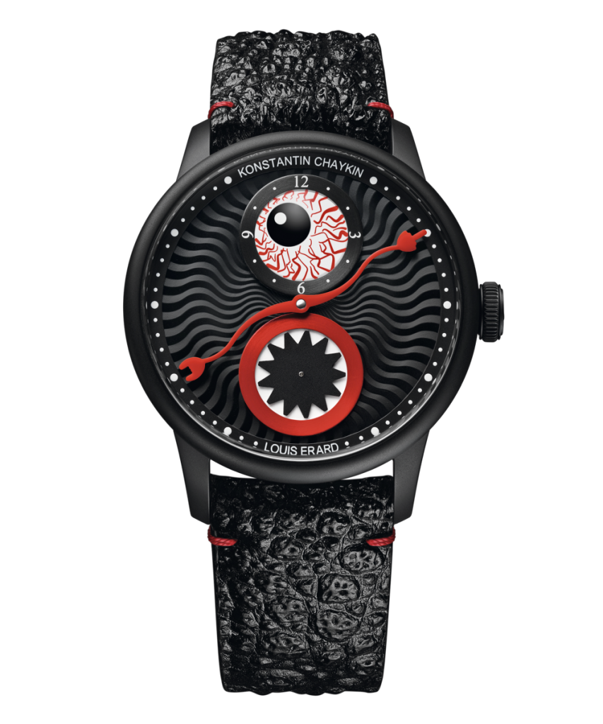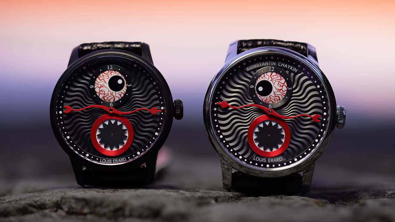 De officiële naam van dit klokje is Le Régulateur Louis Erard x Konstantin Chaykin Dusk to Dawn en dat is een behoorlijke bek vol. De bedenkers noemen het nieuwe horloge ook wel een polsmonster. En terecht, want op de wijzerplaat kun je een gruwelgezicht met cycloopoog en zaagmond ontwaren. De inspiratiebron daarvoor was de Likho-legende, een Slavisch verhaal over de belichaming van het kwaad. Het creepy klokje kost je ruim vierduizend euro – en ook dat is wel even schrikken.