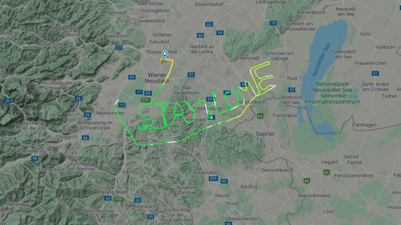 Een piloot in Oostenrijk helpt deze boodschap te verspreiden, want ook in andere landen in Europa gelden de maatregelen. De vlieger legde een bijzondere route af waarbij hij het bericht stay home achterliet, meldt Flightradar24.