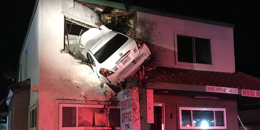 Nee, dit is geen scenario uit een of andere actiefilm, maar is onlangs echt gebeurd in Santa Ana, Californië. Een man reed veel te hard in zijn auto, raakte de middenberm en werd toen als het ware gelanceerd, zo de wachtkamer in van de tandarts. Op de tweede verdieping (we benadrukken het nog eens, omdat het zo absurd is).