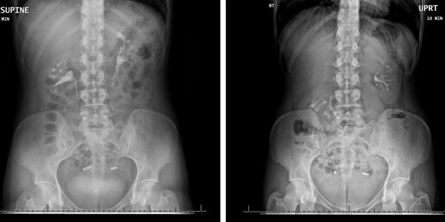 Op de linker scan lag de vrouw op haar rug en op de rechter stond ze rechtop. De rechter nier (omcirkeld in de rechter afbeelding) bevindt zich duidelijk een stuk lager dan de linker die nog netjes op zijn plek net onder de ribben zit.