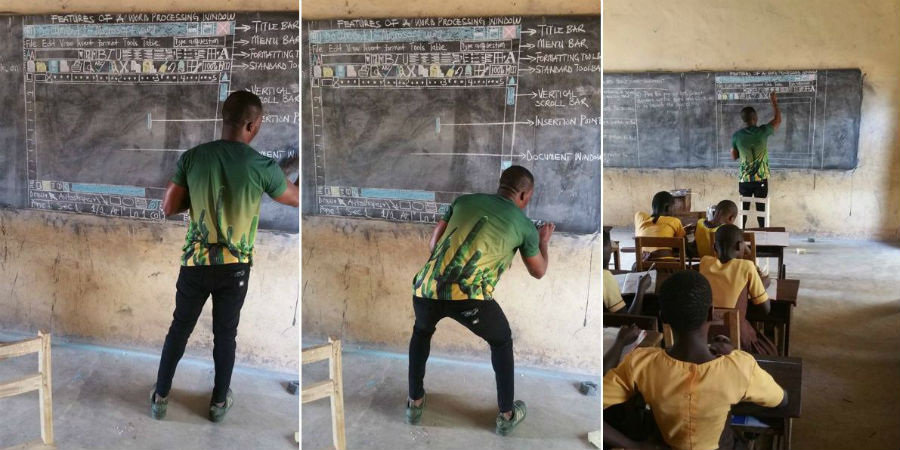 Geen probleem, dacht de Ghanese docent Richard Appiah Akoto. Hij gebruikte gewoon het schoolbord en krijt om zijn studenten te leren hoe ze computerprogramma’s moeten gebruiken door gedetailleerde afbeeldingen te tekenen op het bord. Op onderstaande foto zie je dat Akoto een tekstverwerkingsvenster heeft getekend om het uit te leggen aan zijn studenten. Hij plaatste de foto op social media en deze ging direct viral: