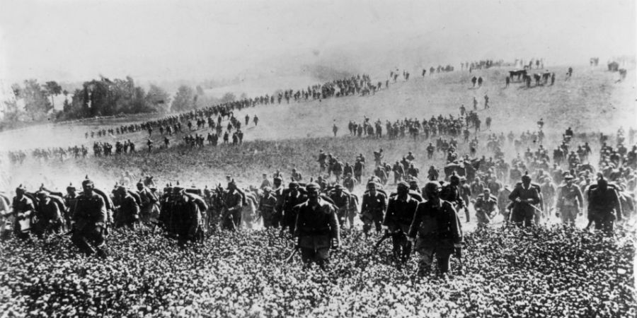 Openingsbeeld: Duitse troepen rukken op in augustus 1914. Aanvankelijk verliep alles voorspoedig voor de Duitsers, maar juist dat leidde ertoe dat ze overmoedig werden en een snelle overwinning op het Franse leger uit handen gaven.