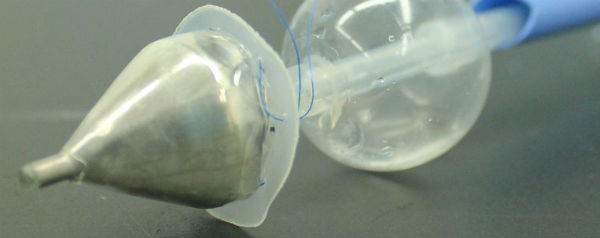 Aan het uiteinde van het slangetje zitten twee nog lege ballonnetjes met ertussen het inzetstukje gemaakt van biologisch afbreekbaar materiaal. Wanneer het uiterste ballonnetje door het te dichten gaatje in het orgaan wordt gestoken, blazen beide ballonnetjes op. Het tussengelegen inzetstukje wordt hierdoor van beide kanten in het gaatje geduwd.