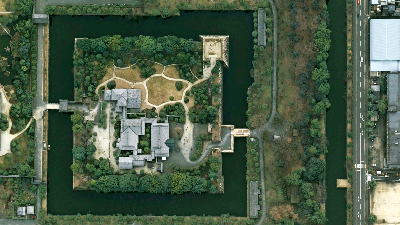 Het lijkt alsof een screenshot uit een of andere game over een echte satellietopname van een stad is geplakt. In werkelijkheid kijken we naar het Nijo-kasteel in de voormalige Japanse hoofdstad Kyoto. De bouw ervan begon in 1601 en in 1626 werd het in gebruik genomen door Tokugawa Iemitsu. Deze shogun was de derde in een lange lijn van Tokugawa’s die het land bijna 250 jaar lang zouden regeren.