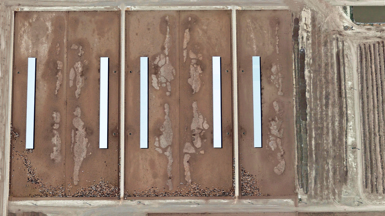 Op het eerste gezicht denk je misschien: hé, wat een bijzondere versie van de oer-computergame Pong. Als je wat beter kijkt, zie je onderin het beeld gefriemel. Dat zijn geen mieren, maar koeien. En de witte strepen zijn geen batjes waarmee je een vierkant balletje over het beeldscherm mept, maar open stallen waar de dieren worden gevoerd en ze een tijdje in de schaduw kunnen uitbuiken.
