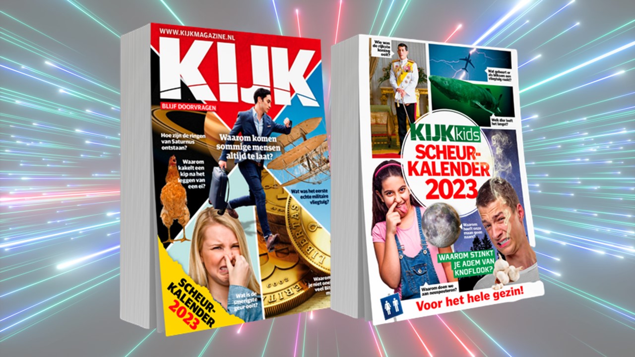 Hét magazine over baanbrekende wetenschap en vernieuwende technologie brengt elk jaar ook een scheurkalender uit, waarin dagelijks een prangende vraag wordt beantwoord én een boeiend feitje wordt gedeeld. Voor 2023 hebben we nog een kalender gemaakt, speciaal voor de nieuwsgierigen vanaf 10 jaar: de KIJK Kids-kalender. Beide scheurkalenders zijn nu te koop.