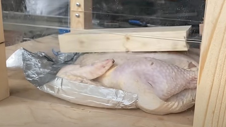 Zoals je in onderstaande video kunt zien, had het experiment van Weisz heel wat voeten in de aarde. Het kostte hem in totaal twee maanden – van het testen van de theorie en het bouwen van een supersnelle kippenmepper, tot het daadwerkelijk koken van de kip. Maar uiteindelijk slaagt de YouTuber erin een kippetje klaar te maken.