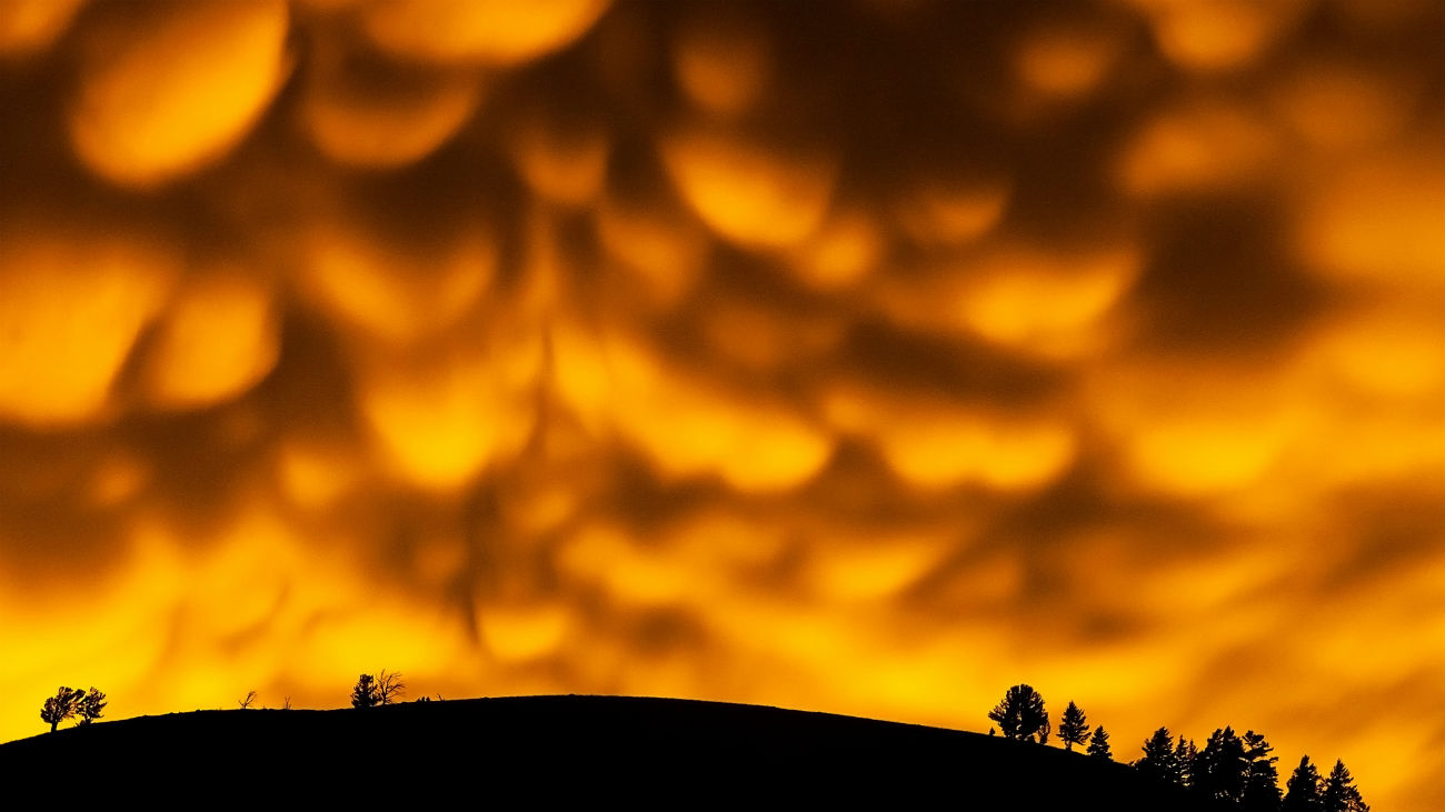 Het is een onheilspellende foto, bijna alsof het einde der tijden nabij is. Fotograaf Cándido R. Vicente Calle schoot deze bijzondere plaat bij Jackson, in de Amerikaanse staat Wyoming. De gladde buidels aan de hemel, oranje verlicht door de ondergaande zon, steken sterk af tegen het landelijke silhouet op de voorgrond.