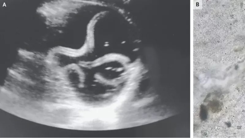 Bij het zien van een echofoto verwacht je natuurlijk een baby te zien. Alleen zijn er op deze plaat niet tien kleine vingers en tenen zichtbaar, maar slechts een langgerekte sliert. Juist, je kijkt naar de echo van een rondworm, Ascaris lumbricoides om precies te zijn. Dit is een parasiet die mens en dier kan infecteren.